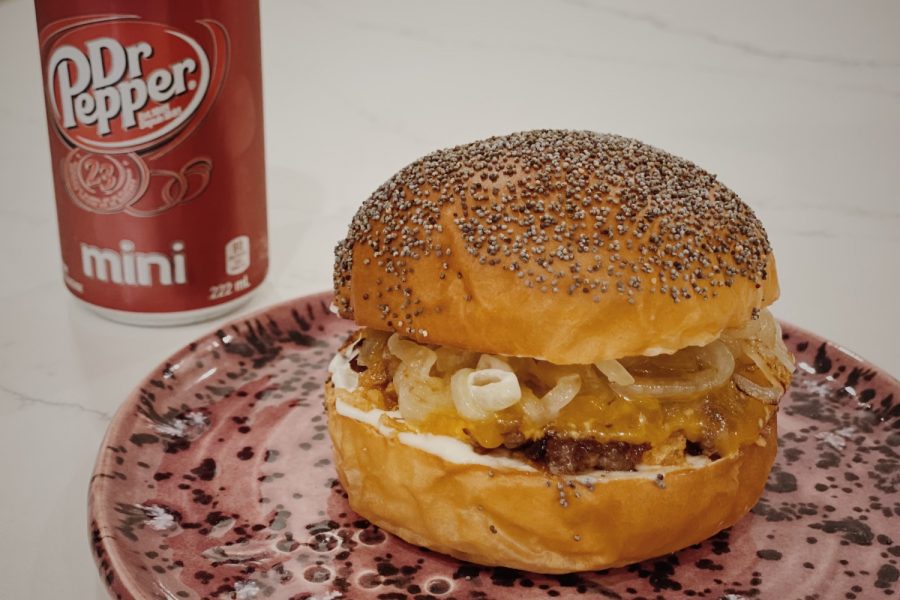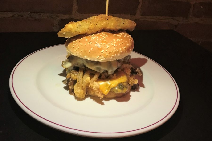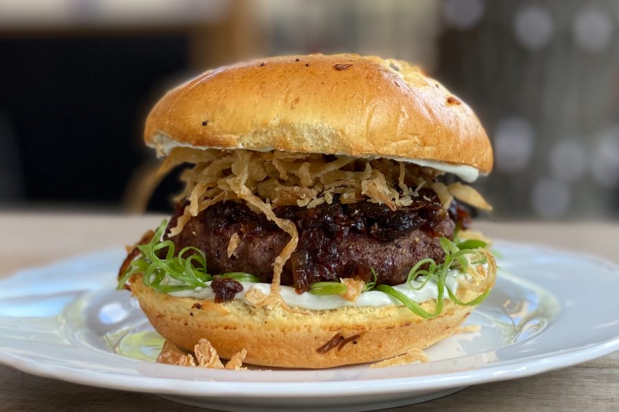 The Lil’ Chz Burger with house ground grass fed beef, fried onions, crispy onions, cheddar, Clementine’s classified aioli, served on a garlic butter milk bun.