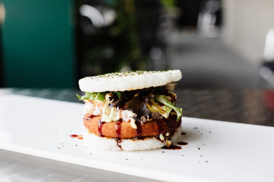 Manitoba Pickerel patty topped with crab meat, wasabi tartar sauce, sweet soya, Japanese pickled radish, and mixed greens, on a roasted sushi rice bun.