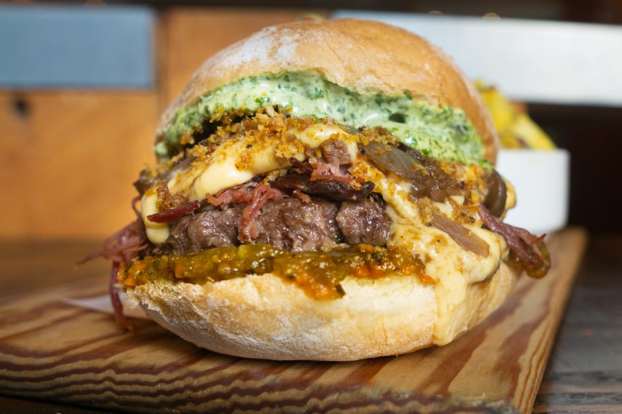 House-made brisket + chuck patty topped with King + Bannatyne’s very-own braised beef, creamy queso cheese sauce, apple cider caramelized onions, sweet + spicy jalapeño relish and King + Bann salsa verde burger sauce and La Cocina taco crumble.