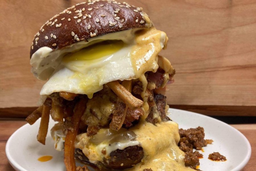 Whether you’ve overindulged the night before or not, this burger will cure what ails you and satisfy. 1/2 lb ground chuck, house aioli, caramelized onions, cheddar cheese, crisp bacon, home fries, no bean chili, cheese sauce and a sunny side up egg on a pretzel bun. We dare ya!