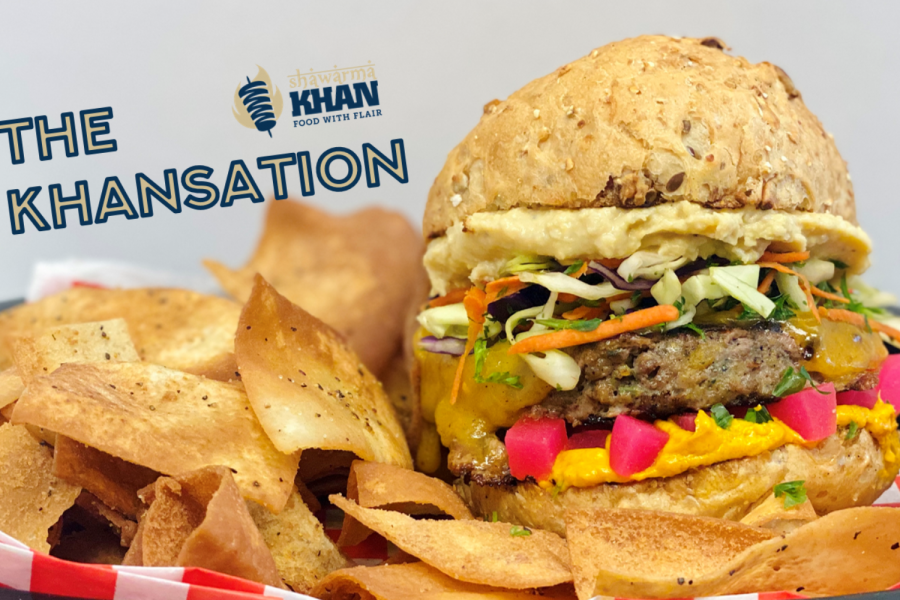 Shawarma Khan’s reputable beef & lamb patty topped with mature cheddar cheese. Its signature garlic sauce with a curry twist accompanies, caramelized onions, middle eastern slaw, pickled turnips and hummus. All between a potato scallion bun. Served with a side of chips and dip. *Meat burger can be substituted for a falafel burger. Burger can be made vegan and vegetarian.