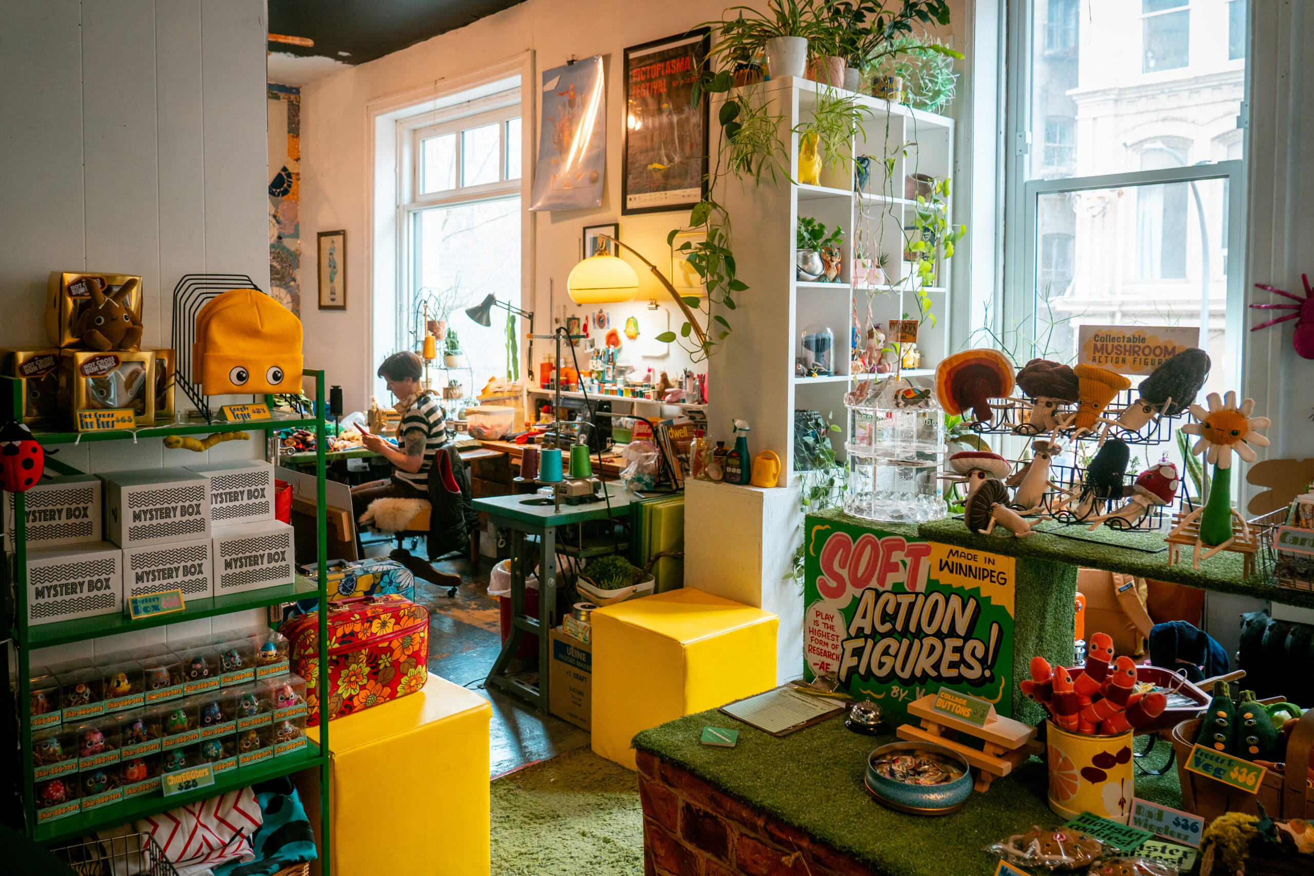 Kami Goertz creates a whimsical world where flowers lounge, rocks narrate history, and mushrooms and cacti thrive. Using vintage, reclaimed, and premium materials, she weaves her love for ecology, mycology, fibre and food into her plush characters. Inspired by her belief that one is never too old for a stuffed companion, Kami infuses her soft action figures with heartfelt craftsmanship, sending them into the world to charm collectors and foster a sense of connection.