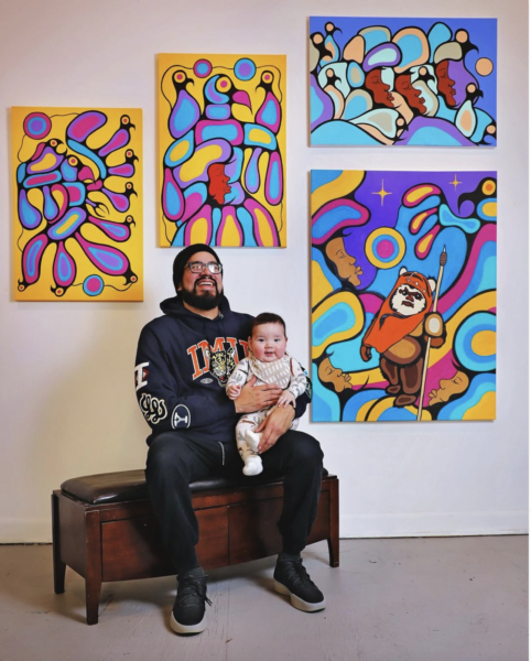 Blake Angeconeb, a self-trained Anishinaabe woodlands artist from Treaty 3 territory, began his artistic journey six years ago during a painting session with his niece. Since then, he has developed his passion into a full-time career, blending woodland art with pop culture references through acrylics and multimedia on canvas.
