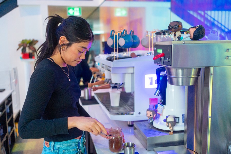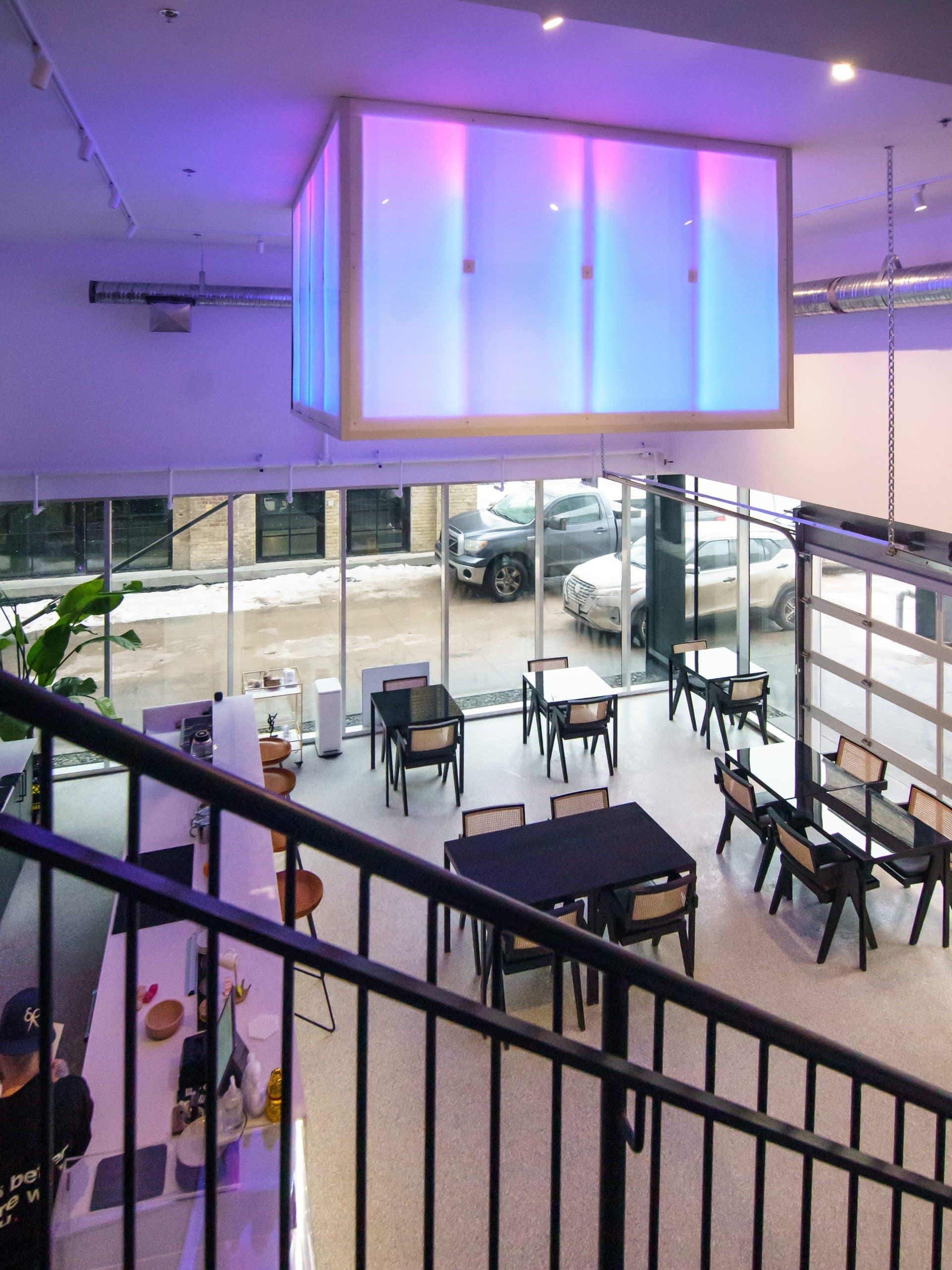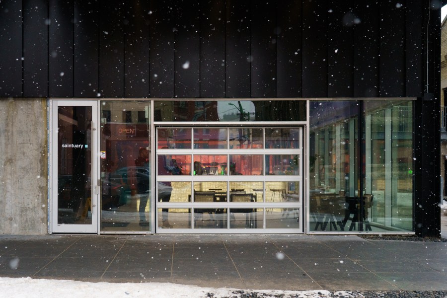 Everything about Saintuary is designed to be welcoming. Its industrial yet modern interior features eye-catching iridescent walls, a design inspired by a pencil case Scott’s sister once gave him. A large cube lightbox, representing a home, hangs in the space, and the big, bright windows invite people in. The design was brought to life with help from ATLRG architecture, Alston properties, Brenton construction, and Alai studios. Small and colourful tchotchkes fill the space, most created by staff or donated by friends.
