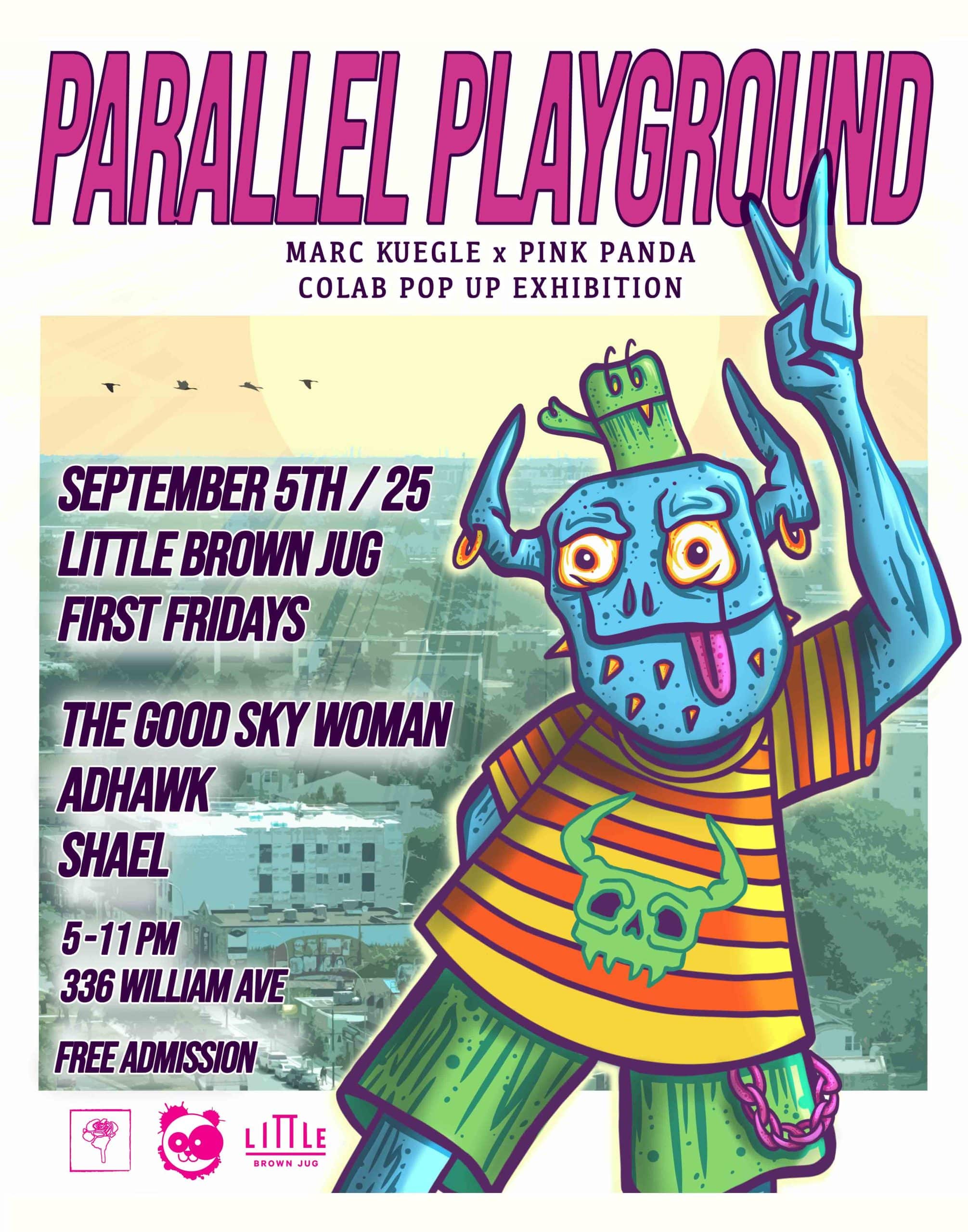 Parallel Playground is a collaborative pop-up exhibition by artists Marc Kuegle and Pink Panda, blending vibrant, character-driven pop art with surreal, travel-inspired landscapes. Happening as part of First Fridays, the one-night show takes place on…