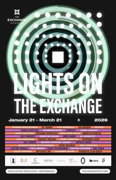 Lights On the Exchange 2026 is produced by the Exchange District BIZ, in collaboration with our curatorial partners: Artspace Inc, Manufacturing Entertainment, PLATFORM Centre for Photographic and Digital Arts, and Winnipeg Film Group.